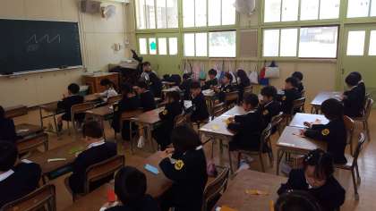 1年生は、図画工作の時間でした。色紙を手でちぎっていました。みんな、先生の言うとおりにちぎることができたかな。
