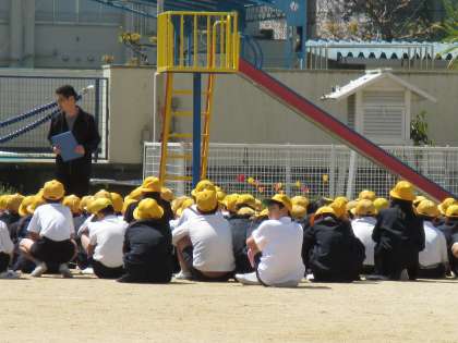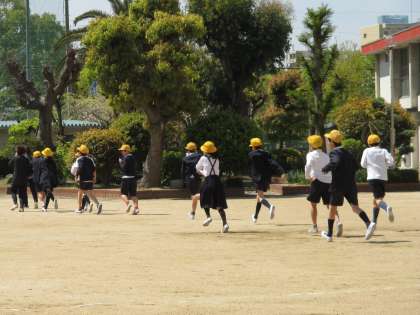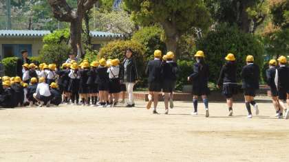 今日の第2校時に、火災に備えての避難訓練がありました。給食室から火災が発生したという想定で行いました。全学年が素早く運動場の南側に避難しました。とても素晴らしかったです。