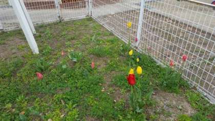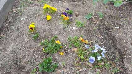校庭のあちらこちらに花が咲いています。区の花パンジーやチューリップ、どこに咲いているか分かりますか?