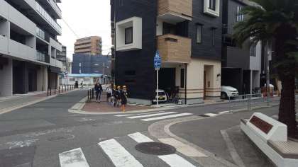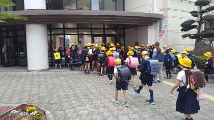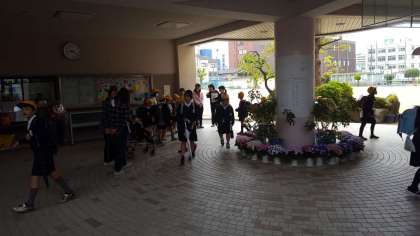 登校の様子です。今日は一時雨の予報が出ているので、傘を持って登校する子が多いです。