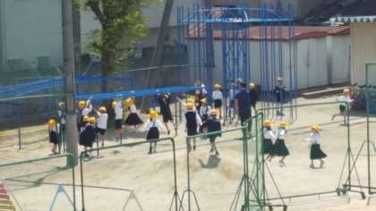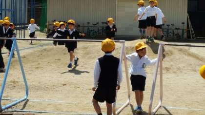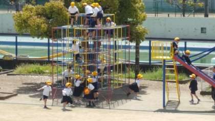 1年生は、外に出て遊具の使い方を学びました。運動場に黄色い歓声が響きわたっていました。