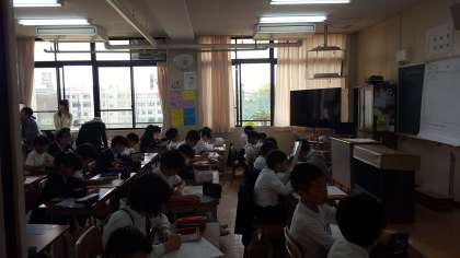 5年生は社会でした。都道府県を重なる字でつないで(和歌山→山口みたいに)いました。子ども達は都道府県を捜し、プリントにたくさんつないでいました。