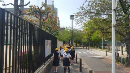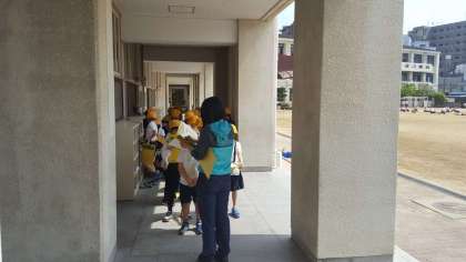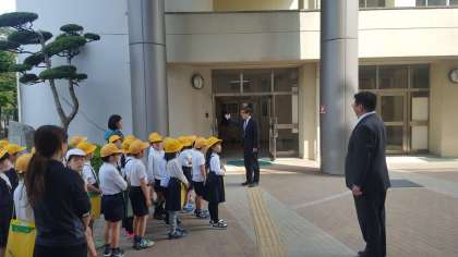 3年生が校区の様子を調べるために、玉津中学校の屋上から校区の様子を見学しました。小学校の屋上は三角屋根で上がることができないので、例年、中学校で見学しています。