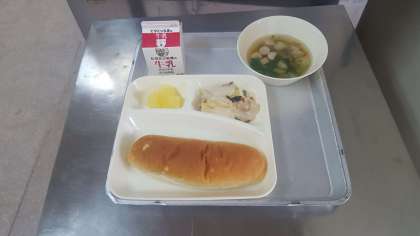 今日の献立は、マカロニグラタン・レタスのスープ・リンゴ(缶)・パン・牛乳です。