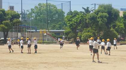 運動場での様子です。風がさわやかで、体を動かすには絶好の天気です。ドッジボール・サッカー・縄跳び・鬼ごっこ・遊具あそび等、思い思いに楽しんでいます。