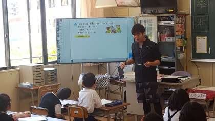 2年2組は算数でした。足し算の学習を、電子黒板を使って行いました。