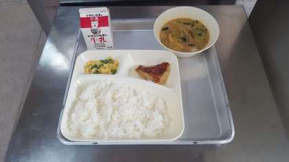 今日の献立は、赤魚の醤油だれかけ・みそ汁・エンドウの卵とじ・ごはん・牛乳です。