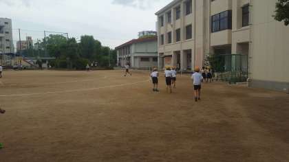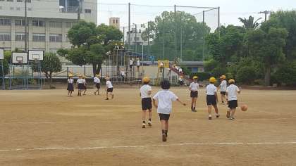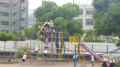 お昼休みの運動場です。サッカー・ドッジボール・おにごっこ・遊具遊びと子どもたちはみんな元気です。