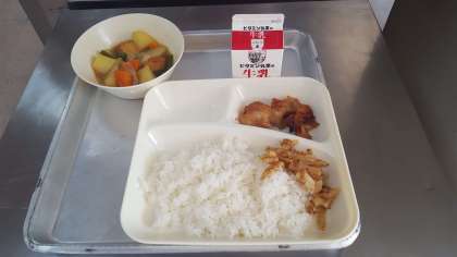 今日の献立は、鶏肉の照り焼き・たけのこのごまかかいため・じゃがいもと厚揚げの煮物・ごはん・牛乳です。