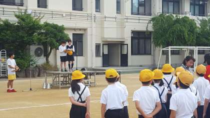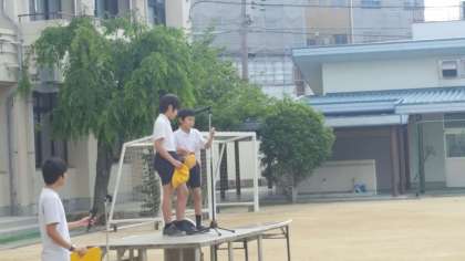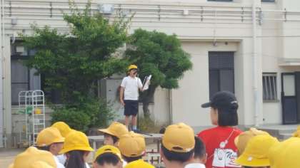 全校朝会で、校長先生から交通安全週間と運動会の目標についてお話がありました。看護当番から、先週の反省と今週の目標についての連絡があり、児童会から、運動会のスローガンが、「勝っても 負けても くいのない運動会」に決まったというお知らせがありました。みなさんも個人の目標をもって、それに向かってがんばりましょう。