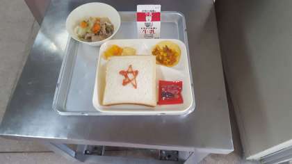 今日の献立は、豚肉と野菜のスープ煮・変わりピザ・ミックスフルーツ(缶)・パン(スター入り)・牛乳です。