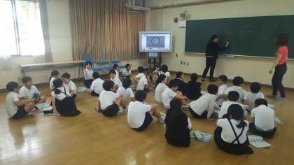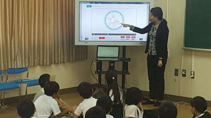 4年生の英語の学習の様子です。C−NETの指示通りに4人組に分かれて、楽しくリズムに乗って活動していました。元気な声が、廊下まで響き渡っていました。