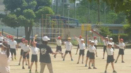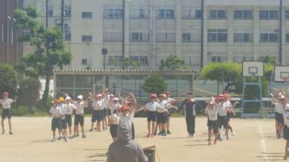 5・6年生が、運動場で団体演技の練習をしました。演技する位置を確認しながら進めていきました。その一部だけを公開します。