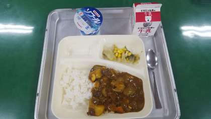 今日の献立は、牛肉と大豆のカレーライス・レタスとコーンのサラダ・牛乳です。