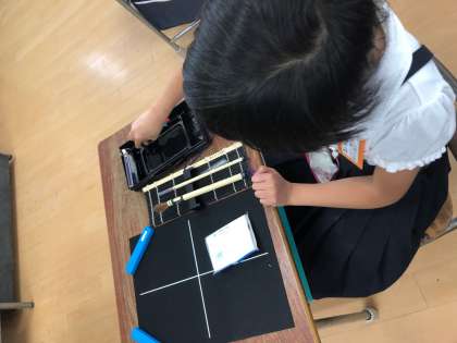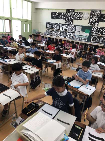 3年生が、初めて毛筆の学習をしました。習字道具の置く位置、墨のすり方、筆の握り方や姿勢等を学んで、毛筆の基本中の基本である「一」の字を半紙に書きました。みんな一生懸命がんばりました。