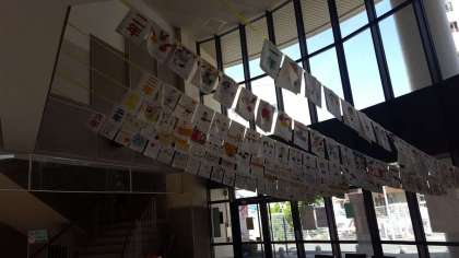 子ども達が描いた運動会の旗を、玄関に展示しています。