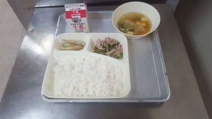 今日の献立は、いわし天ぷら・すまし汁・豚肉と三度豆の炒め物・ごはん・牛乳です。