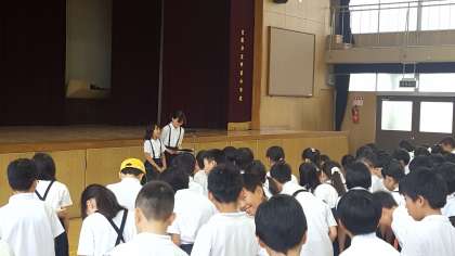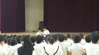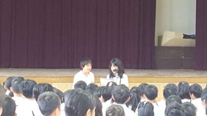 運動場が使えないので、講堂で朝会がありました。