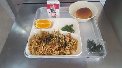 今日の献立は、焼きそば・オクラのかつお梅風味・オレンジ・パン・牛乳です。