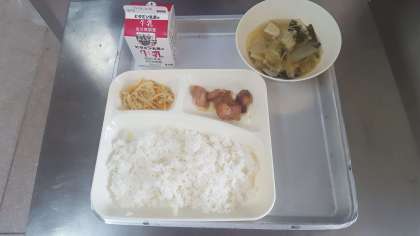 今日の献立は、鶏肉の醤油バター焼き・切干大根の炒め煮・五目汁・ごはん・牛乳です。