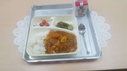 今日の献立は、ハヤシライス・きゅうりのサラダ・さくらんぼ・牛乳です。