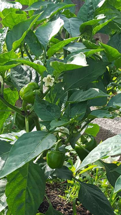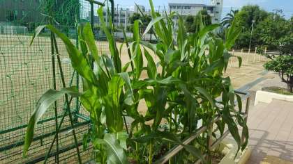 夏野菜のピーマンが大きくなってきました。トウモロコシの草丈も、子どもより高くなりました。