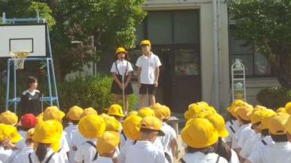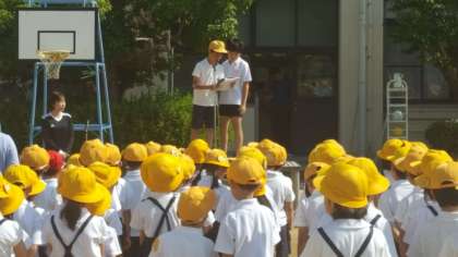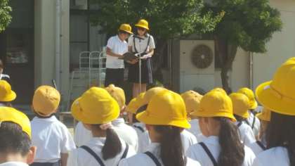 全校朝会があり、校長先生から、G20・大阪サミットについてのお話がありました。看護当番の子ども達からは、先週の反省と今週の目標の話がありました。また代表委員会からのお知らせもありました。
