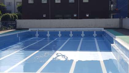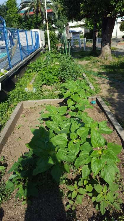 プール清掃をしました。来週月曜日から、プール水泳が始まります。ヒマワリがぐんぐん生長しています。夏の植物の勢いを感じます。