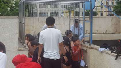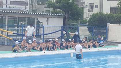3・4時間目に1・2年生のプール開きをしました。シャワーの浴び方・並び方・入り方を練習していよいよプールに入ります。