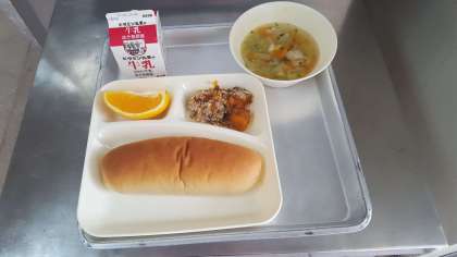 今日の献立は、カボチャのミートグラタン・スープ・オレンジ・パン・牛乳です。