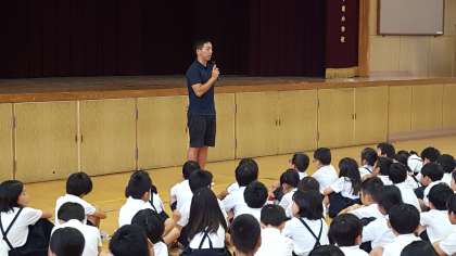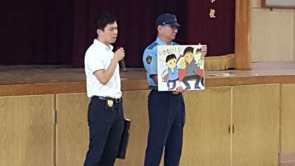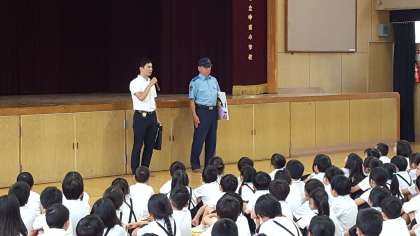 不審者を確保した後に、講堂に避難をして、東成警察の方のお話を聞きました。お巡りさんからは、静かに素早く非難できたとほめていただきました。