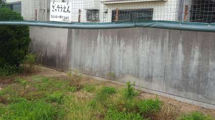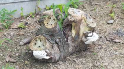 運動場に、ざっそうえんがあるのを知っていましたか。切り株にキノコがついていました。キノコには触れないようにしましょう。