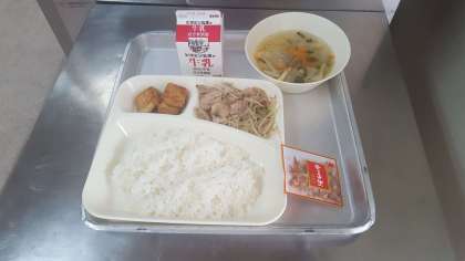 今日の献立は、ゴーヤチャンプルー・厚揚げの生姜醤油がけ・すまし汁・ごはん・牛乳です。