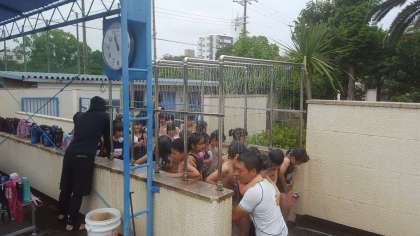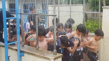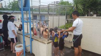 1・2年生のシャワーを浴びる様子です。みんな頑張っています。手足・頭・胸・お尻と、全身しっかり水に慣らします。
