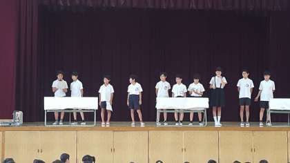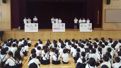 それぞれ、自分たちの考えたメニューをアピールしていました。集会の終わりに、各学年が投票をして、教室に戻りました。