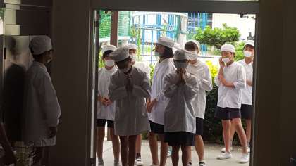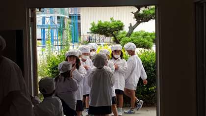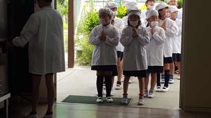 給食の準備の様子です。どの学年も給食室の入り口で、大きな声であいさつをします。役割分担をして、手際よく運んでいきます。