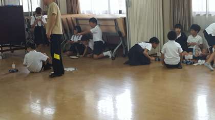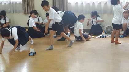 3年生は、理科の授業でした。風のはたらきの実験をしていました。うちわやサーキュレーターを使って、車を動かしていました。
