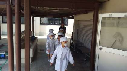 2年1組の給食当番が給食を取りに来ました。みんなで協力していただきましょう。