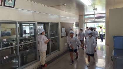 6年1組の給食室での様子です。大きな声でお礼を言っていました。今日も楽しくしっかり食べましょう。
