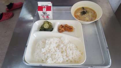 今日の献立は、豚肉の香味揚げ・みそ汁・きゅうりの甘酢づけ・ごはん・牛乳です。