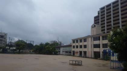 雨に濡れている学校の様子です。