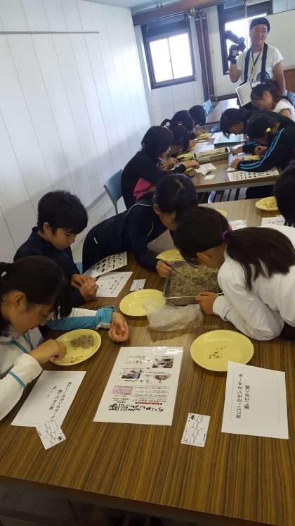 ちりめんモンスター探しが始まりました。一生懸命に探しています。