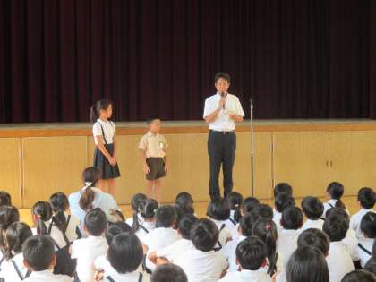 2学期の始業式の様子です。まず校長先生から、転入してきた2人の子ども達の紹介がありました。2人とも力強く「よろしくお願いします。」とあいさつができました。