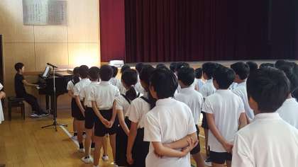 校長先生のお話の後に、生活指導の話を聞き、校歌を歌いました。