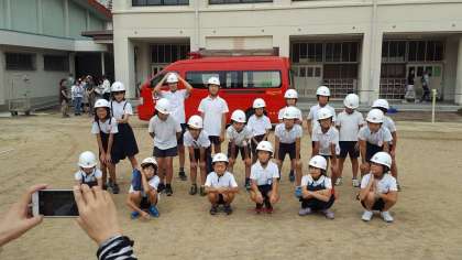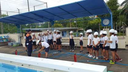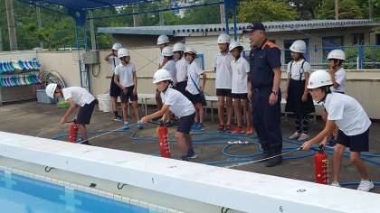 次に、プールに移動して消火器訓練をしました。消防署の方から、消火器の使い方、消火のポイントの指導を受け、体験しました。明日は、ヘルメットを持参し、リーダーとして防災訓練に臨みます。