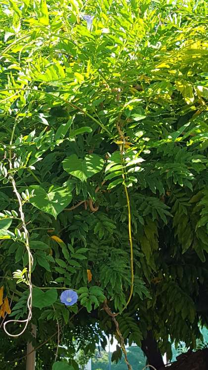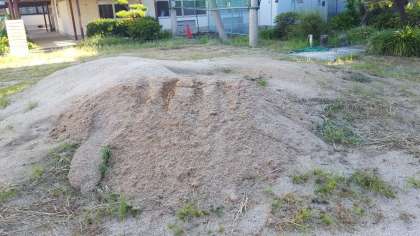 運動場の補修用の土が納入され、山が高くなりました。藤棚に朝顔が巻き付いて、花を咲かせていました。