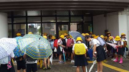 傘をさしての登校になりました。昨日までは、暑さのため運動場が使えませんでしたが、今日は雨のため使えません。我慢しましょう。