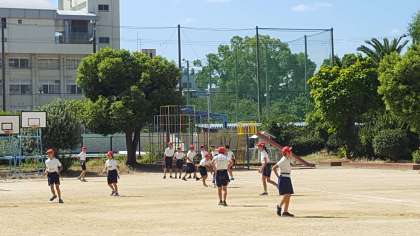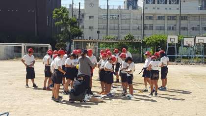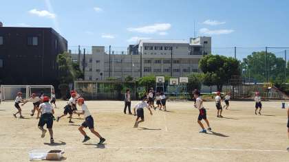 久しぶりに6年生が運動場で体育をしました。タグラグビーの練習でした。