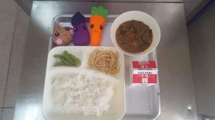 今日の献立は、マーボーなす・もやしのごま酢和え・枝豆・ごはん・牛乳です。
