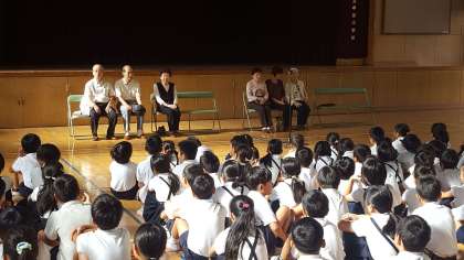 今朝、講堂で敬老お祝いの会がありました。地域より6人の長寿会の方が来校されました。ありがとうございました。